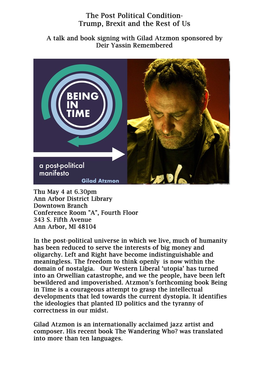 Atzmon talk and book-signing @ Ann Arbor District Library, Downtown Branch, Conference Room “A”, Fourth Floor, 343 S. Fifth Avenue, Ann Arbor, MI 48104 |