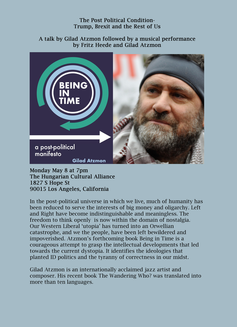 7pm, Gilad Atzmon talk and book-signing, The Hungarian Cultural Alliance, 1827 S. Hope St. 90015 Los Angeles, CA |