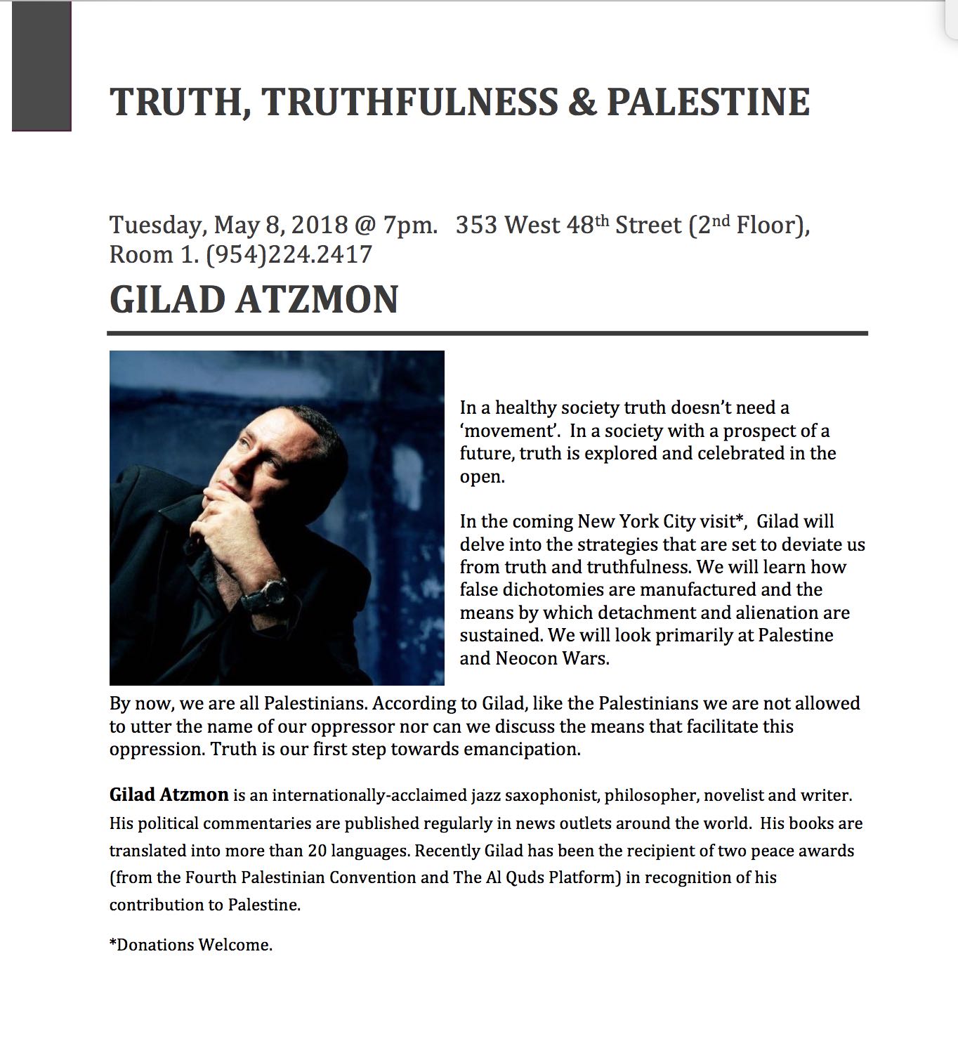 Friday 11 May, 8 pm Truth, Truthfulness and Palestine, a talk and Q&A with Gilad Atzmon – AL Nahda 10555 Southwest Highway, Worth, IL (Chicago)