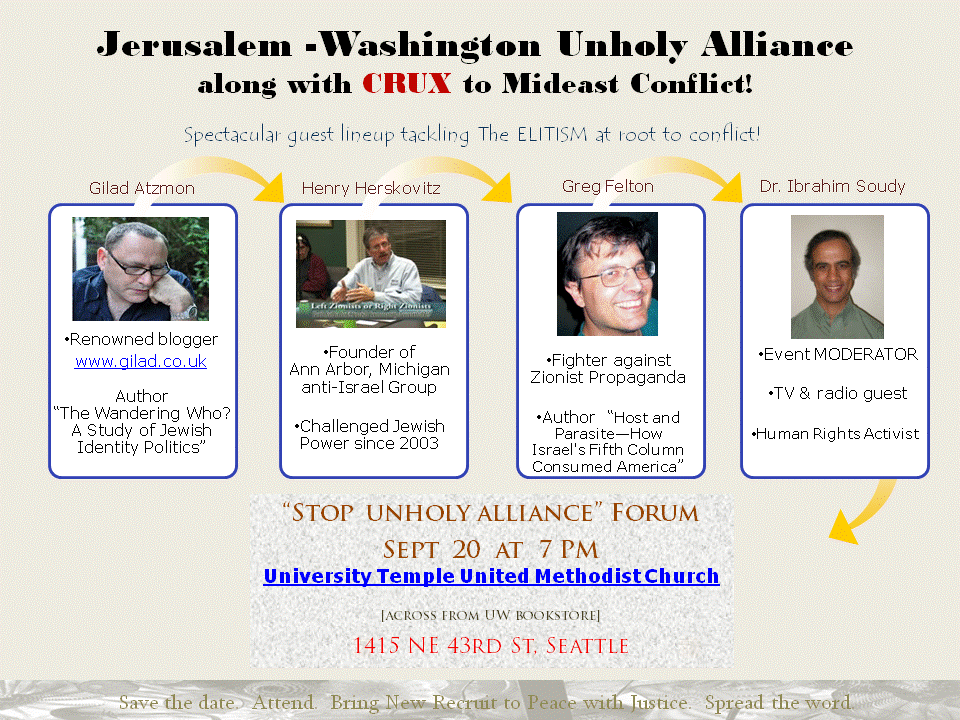 Speakers: Gilad Atzmon, Henry Herskovitz, Greg Felton, and Dr. Ibrahim Soudy”